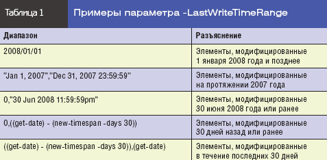 Параметр -LastWriteTimeRange указывает включающий границы диапазон дат; этот аргумент тоже может быть массивом. Элементы, у которых значение свойства LastWriteTime находится внутри указанного диапазона, включаются в выходные данные сценария. Если в качестве аргумента для данного параметра указать строки, Whereis.ps1 попытается преобразовать их в объекты DateTime. Если указать одну дату, Whereis.ps1 будет интерпретировать диапазон дат как «указанная дата или позднее». Если же вы укажете массив, сценарий Whereis.ps1 будет интерпретировать первый элемент массива как дату, которая является самой ранней границей массива дат, а второй элемент — как самую позднюю дату массива. Вы можете задать диапазон типа «ранее, чем»; для этого в качестве первого элемента массива следует указать ноль. В таблице 1 приведены некоторые примеры параметра -LastWriteTimeRange.
