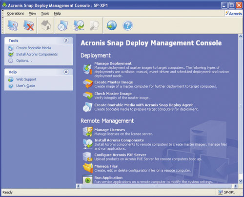 Дополнительные возможности. В дополнение к функциям развертывания, Acronis Snap Deploy располагает простым инструментарием дистанционного управления. Можно создавать, изменять и удалять файлы и даже запускать приложения на удаленных компьютерах. Учтите, что для этого потребуется установить агент.