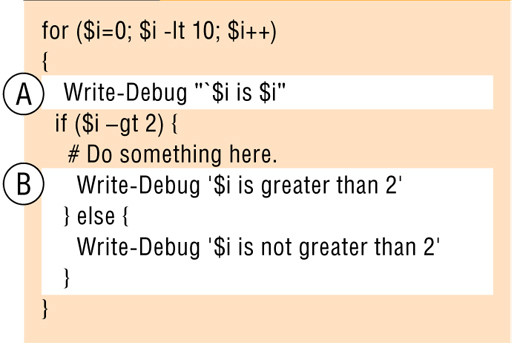 Затем нужно ввести инструкцию Write-Debug в каждый цикл и конструкцию принятия решения. В листинге показано, как применить метод для цикла for и конструкции if. В инструкции Write-Debug во фрагменте A используется тот же прием с двойными кавычками и обратным апострофом, чтобы выяснить содержимое $i при каждом повторении цикла for. В конструкции if используются две функции Write-Debug, в том числе и в конструкции else (фрагмент B). Таким образом удается собрать данные для диагностики независимо от ветвления, несмотря на отсутствие программного кода, который бы исполнялся, когда значение $i не больше 2. Обратите внимание, что для вывода инструкций Write-Debug используется одинарная кавычка, чтобы не заменять переменную $i ее содержимым.