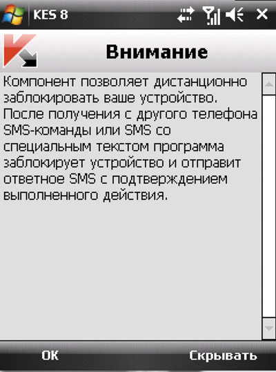Kaspersky Endpoint Security 8 for Smartphone позволяет дистанционно запустить функции «Анти-Вора» с помощью отправки SMS-команды с другого мобильного устройства.