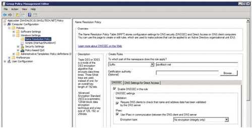 Для настройки ожидания клиентами DNS проверки DNSSEC используется таблица Name Resolution Policy Table (NRPT), в которой определяется, каким образом механизмы безопасности будут применяться в работе службы DNS: используются ли отдельные записи для различных пространств DNS (например, microsoft.com), требуется ли проверка механизмами DNSSEC для каждого пространства имен, а также должны ли использоваться механизмы IPsec при обменах между клиентом и ближайшим к нему сервером DNS (то есть локальным сервером DNS). Обычно управление таблицей NRPT осуществляется через групповую политику, чтобы вручную не настраивать ее на каждой клиентской машине. На экране 3 показана простейшая политика. Имейте в виду, что таблица NRPT может иметь в своей основе не только суффикс DNS — вы можете использовать префикс, полное доменное имя (FQDN), а также имя подсети.