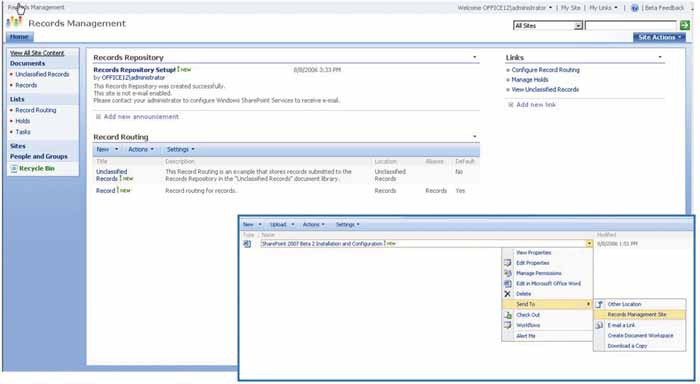 Хотя Microsoft выпустила SharePoint 2010, у SharePoint 2007 есть свои достоинства, и многие организации в ближайшее время не будут модернизировать его. В SharePoint 2007 есть шаблон сайта, называемый Records Center. В нем предусмотрена такая функция, как Holds, которая помогает зафиксировать расписание удержания, и Auditing, которая регистрирует события и операции с записью. В SharePoint 2007 также существует несколько специализированных библиотек и обеспечивается настройка маршрутизации по типу контента, которая помогает производить маршрутизацию записей по типу контента.