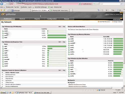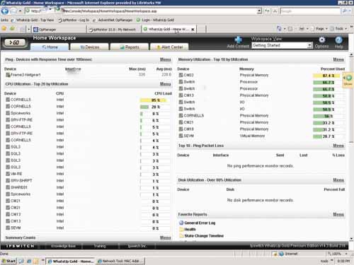 При работе с системами IpMonitor и OpManager я время от времени сталкивался с непонятными показаниями, которые ставили меня в тупик. В системе IpMonitor в рабочих панелях могли отображаться отрицательные значения, когда уровень загрузки процессора значительно снижался. В другом случае при загруженности процессора близкой к нулю система IpMonitor прислала мне уведомление, что процессор задействован на 11,490%! Система OpManager, отслеживая и присылая мне корректную информацию об использовании дисков контроллеров домена, при этом в некоторых случаях не включала ни один из контроллеров в список 10 серверов с максимальным использованием дискового пространства. При этом соседняя панель извещала о том, что один из моих контроллеров домена должен быть даже не в десятке, а в тройке. При использовании WhatsUp Gold я не сталкивался с подобными ситуациями. Система WhatsUp Gold отслеживает загруженность ядер процессоров в своих панелях, и, когда я сравнил результаты из панелей WhatsUp Gold с показаниями средства Windows Performance Monitor, они в точности совпали по каждому из ядер. Аналогично, информация об использовании жестких дисков корректно передавалась на все соответствующие приложения рабочей области.