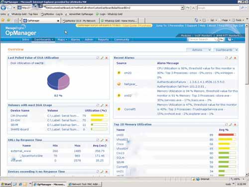 Среди трех рассматриваемых продуктов только система OpManager имела раздел, предназначенный для мониторинга качества обменов VoIP в глобальной сети. Для использования инструментов мониторинга VoIP необходимо, чтобы устройства, как в сети источника, так и в сети назначения, поддерживали технологию Cisco IP SLA. Кроме того, система OpManager, интерфейс которой показан на экране 2, включает в себя больше сенсоров и рабочих панелей, чем любой из конкурирующих продуктов.