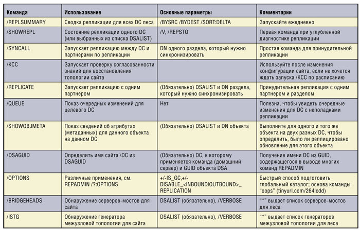 | Таблица. Распространенные команды REPADMIN |