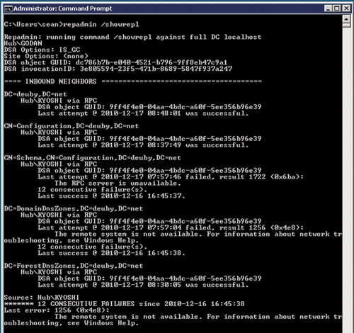 Как правило, первой из команд REPADMIN выполняют /SHOWREPL применительно к DC, который не получает обновлений. Результат показан на экране 2. Данные легче проанализировать, если разделить его на секции. В первом разделе, предшествующем пунктирной линии, показана общая информация о DC. В частности, данные показывают, что DC является сервером глобального каталога, и отображается GUID объекта DSA. В следующей секции показан каждый раздел, в формате различающегося имени (DN), размещенный на этом контроллере домена. Кроме того, показан партнер репликации DC (и GUID объекта DSA партнера), а также время последней успешной репликации DC.