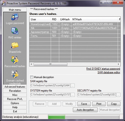 Также указанный файл можно получить, загрузившись с внешнего носителя. В случае наличия загрузки двух операционных систем процесс копирования файла SAM существенно упрощается. При наличии физической копии файла SAM извлечь хранящуюся в нем информацию не составляет большого труда. Загрузив файл SAM в реестр любого другого компьютера с Windows (например, с помощью команды Load Hive программы REGEDT32), можно детально изучить учетные записи пользователей, чтобы определить их значения PID и шифрованные варианты хешированных паролей. Зная PID пользователя и имея зашифрованную версию его хешированного пароля, компьютерный взломщик может попытаться расшифровать этот пароль, чтобы использовать его для получения сетевого доступа к другому компьютеру. Однако для интерактивной регистрации в системе одного лишь знания хешированного пароля недостаточно. Необходимо получить его символьное представление. Для восстановления пользовательских паролей Windows в символьном виде существуют специальные парольные взломщики. Они выполняют как прямой подбор паролей, так и поиск по словарю, а также применяют комбинированный метод взлома парольной защиты, когда в качестве словаря используется файл с заранее вычисленными хешированными паролями, соответствующими символьным последовательностям, которые часто применяются в качестве паролей пользователей операционных систем.