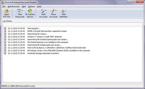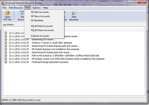 Elcomsoft Internet Password Breaker отображает пароли почтовых ящиков, учетных записей POP3, IMAP, SMTP и NNTP. Поддерживаются все версии Microsoft Outlook, Outlook Express, Windows Mail и Windows Live Mail, включая пароли Microsoft Passport в Windows Live Mail. Для всех версий Microsoft Outlook, включая 2010, Elcomsoft Internet Password Breaker обнаруживает пароли к файлам PST (экран 3).