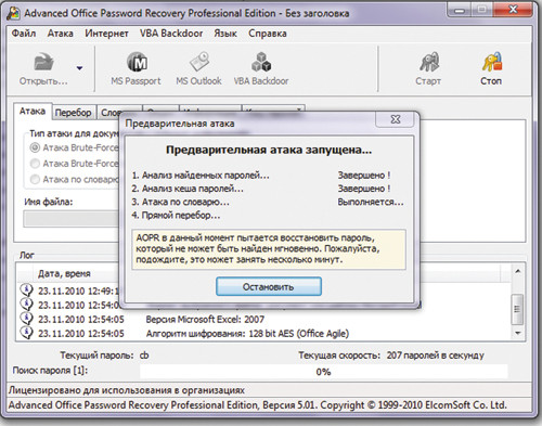 Следующей важной задачей может стать восстановление паролей к документам Microsoft Office. В этом случае необходимо воспользоваться программным обеспечением Advanced Office Password Recovery (экран 4). Атака на пароль осуществляется с помощью словаря, по маске, а также прямым перебором.