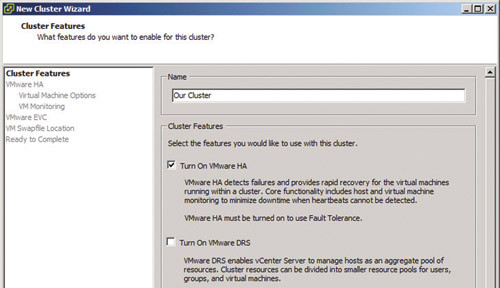 Чтобы создать кластер, щелкните правой кнопкой мыши на центре данных в vSphere Client. Выберите New Cluster, и, как показано на экране 2, появится мастер создания кластера. Каждый кластер нуждается в уникальном имени; можно активизировать один из двух компонентов кластера. В данном примере задействован HA (DRS будет рассмотрен в следующей статье).