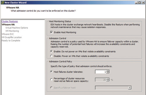 Если установить флажок рядом с HA, в мастер добавляются три экрана, требующих настройки. Эти экраны вызывают замешательство у многих администраторов: выбрать правильные параметры довольно сложно. Некоторые параметры могут повлиять на поведение кластера после отказа, а другие, при ошибочной настройке, способны создать дополнительные проблемы, вместо того чтобы помочь в случае отказа хост-компьютера.