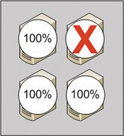 Второй параметр, Admission Control, определяет действие кластера в случае отказа узла, если не хватает ресурсов для восстановления отказавших виртуальных машин на других узлах кластера. В правильно спроектированном кластере всегда достаточно свободных ресурсов, чтобы переместить виртуальные машины любого отказавшего узла на остальные узлы кластера, но часто не хватает оборудования или оказывается слишком много виртуальных машин. Выбор значения параметра Admission Control зависит от доступности и требований к производительности виртуальных машин. Ситуацию проще всего объяснить на «экстремальном» примере. Предположим, что в кластере четыре узла (рисунок 1). На всех четырех узлах функционируют виртуальные машины. Их так много, что каждый узел полностью загружен (стопроцентное использование).