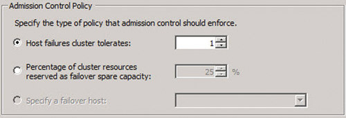 Вернемся к приведенному выше примеру. Для защиты каждой виртуальной машины в четырехузловом кластере следует выделить 25% ресурсов. Но не всегда обязательно защищать каждую виртуальную машину, поскольку не все виртуальные машины критически важны. В случае отказа узла менее ценные виртуальные машины могут бездействовать, пока неисправность не будет устранена. Таким образом, уменьшаются требования к резервированию ресурсов кластера. Если подобный подход применим к вашей компании, полезно избрать политику Percentage of cluster resources reserved as failover spare capacity. Используйте этот режим и в случаях, когда требуется точнее управлять долей резервируемых ресурсов.