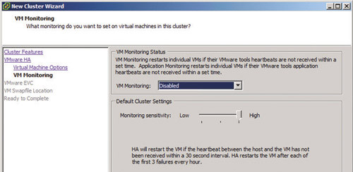 По умолчанию мониторинг виртуальной машины отключен, так как в этом режиме перезапускается виртуальная машина, от которой не поступает сигналов подтверждения соединения. Эти сигналы могут отсутствовать по разным причинам, часть из которых не имеет никакого отношения к виртуальной машине. Например, прием сигналов может быть невозможен из-за отказа VMware Tools или ошибки в настройке сетевой платы виртуальной машины. В любом случае, даже если виртуальная машина функционирует безупречно, отсутствие сигналов синхронизации может заставить vCenter перезапустить виртуальную машину. Как правило, полезно оставить эту функцию отключенной, пока не будет достигнуто полное понимание всех последствий. Как и в других случаях, всегда можно внести изменения после создания кластера.