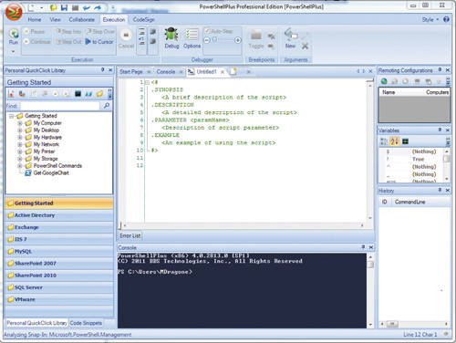 Среда разработки включает в себя функции, знакомые каждому, кто использовал Visual Studio. Это такие функции, как цвет кода, заполнение кода, отладка неисправностей, примеры кодов и IntelliSense — функция, которую, к сожалению, специалисты Microsoft не включили в PowerShell 2.0 ISE. Эти функции стоят в одном ряду со стандартными продуктами редактора, такими как аннулирование операций, повторные операции, поиск и замена. Одной из вкладок среды является рабочая консоль PowerShell. Это место, откуда вы можете запускать любые сценарии, которые создаете, либо использовать команды PowerShell. Вы можете видеть запуск сценариев в режиме реального времени и следите за окном консоли PowerShell, которым можно манипулировать изнутри IDE, — это очень удобно.